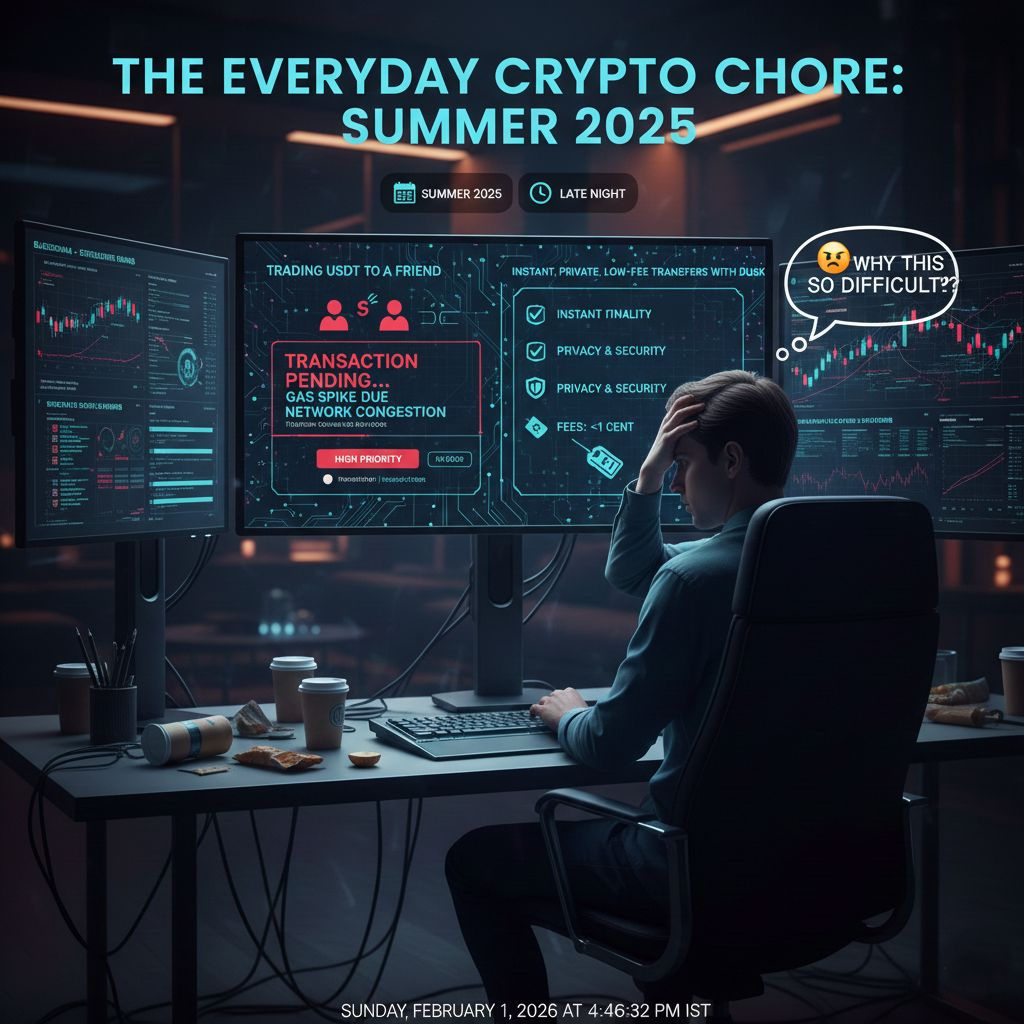 I remember sitting there last summer and trying to send a few hundred dollars in USDT to a friend who lived in another country. It was one of those things that happened late at night nothing big, just paying for some of the trip costs. The app said the transaction was still going through, but then it had a problem: gas prices went up because the network was full of some random hype drop or whatever was popular at the time. I had to wait 20 minutes and pay extra to get it done faster. By the time it was confirmed, it felt more like a chore than just a transfer. It was not the money that bothered me; it was not knowing, that nagging feeling that something so simple should not need me to babysit it or question the timing.