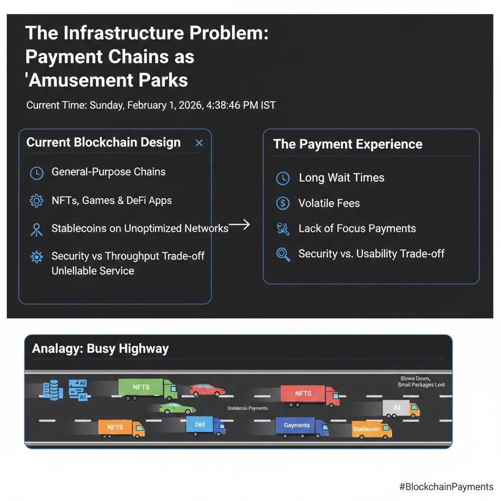 Think about a subway system where all the lines are full of people going to work, tourists, and people moving things at the same time. The tracks were not built just for passenger flow, so your short trip across town turns into a crawl. They try to handle too many things at once, which slows everything down and makes failures more expensive to fix. The core issue is infrastructure design. Without separate lanes for stablecoin transfers and other high-volume, low-complexity traffic, the entire system ends up congested.