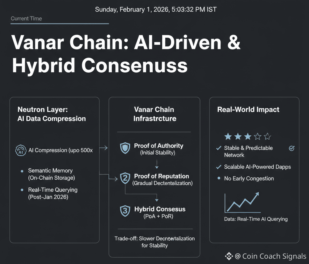 One specific thing about this is how their Neutron layer works. It uses AI to compress raw data up to 500 times its original size, turning it into semantic memory that can be stored and analyzed on-chain without making blocks bigger. That is directly related to how Vanar Chain is acting right now, especially since their AI integration went live in January 2026, which lets users query in real time without needing anything else. Another part of the implementation is the hybrid consensus. It starts with Proof of Authority for stability, where chosen validators handle the first blocks. Then, over time, it adds Proof of Reputation, which scores nodes based on performance metrics to gradually decentralize without sudden changes. This trade-off means that full decentralization will happen more slowly at launch, but it also means that you will not have to deal with the problems of early congestion that can happen in pure PoS setups when validator sets get too big.