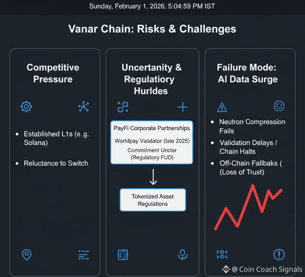There are risks everywhere, and Vanar Chain is no different. If adoption does not pick up, it could be pushed aside by established L1s like Solana, which already have the fastest gaming speeds. Why switch if your app works fine elsewhere? Then there is uncertainty: even though big companies have recently partnered with PayFi, like Worldpay becoming a validator in late 2025, it is still not clear if they will fully commit to its solutions because of the regulatory problems with tokenized assets. One real failure mode I have thought about is when there is a sudden surge of AI queries. If the Neutron compression can not handle the huge amount of data, it could cause validations to be delayed or even temporary chain halts. This is because the semantic processing might not scale linearly, which would force users to use off-chain fallbacks and damage the trust that the chain is built on.