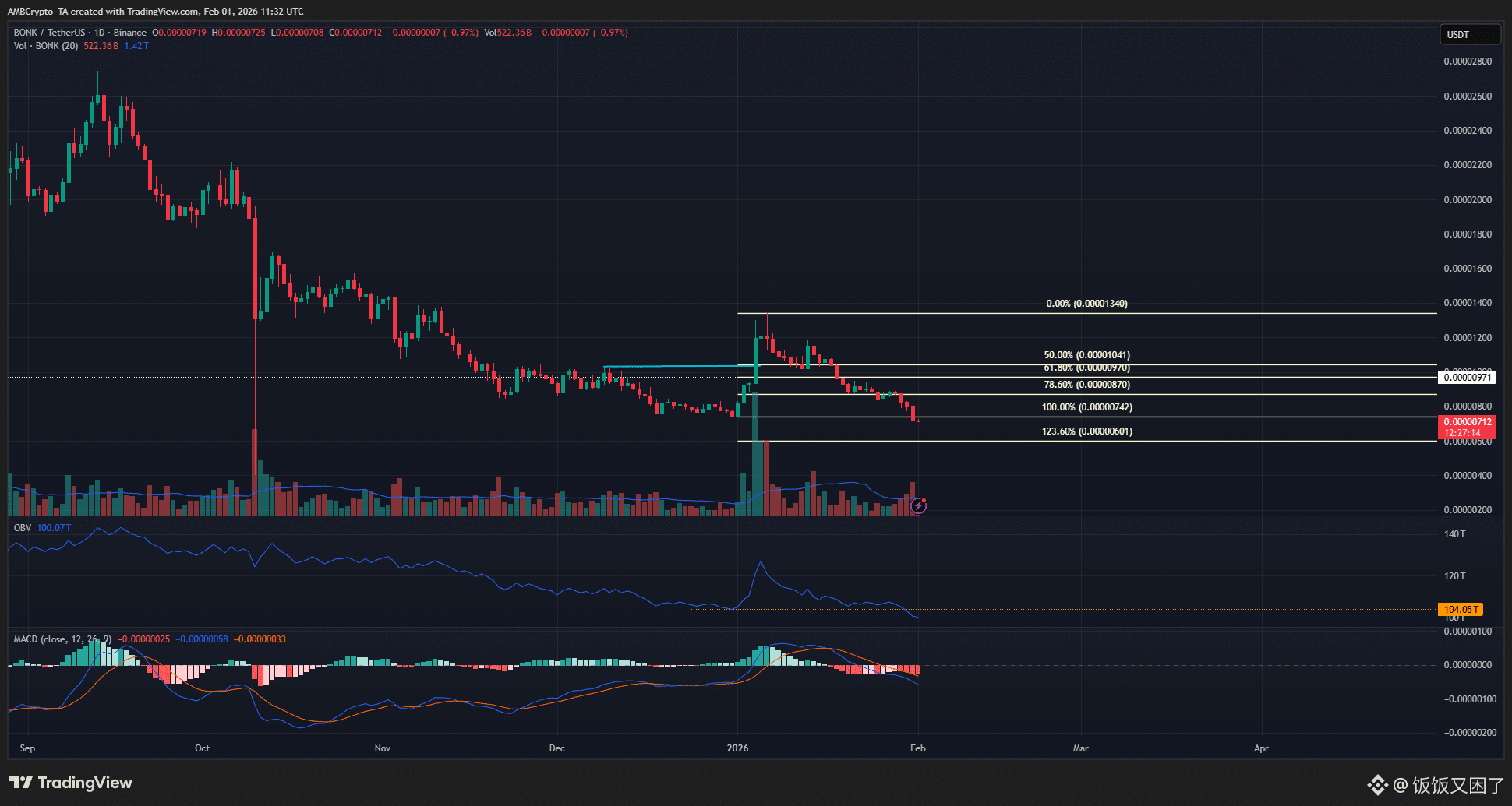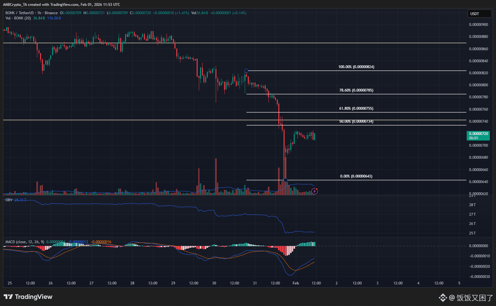 根据最近一段下跌的斐波那契回撤来看,0.00000755–0.00000785 美元是一个重要的短期阻力区。更可能出现的情况是: