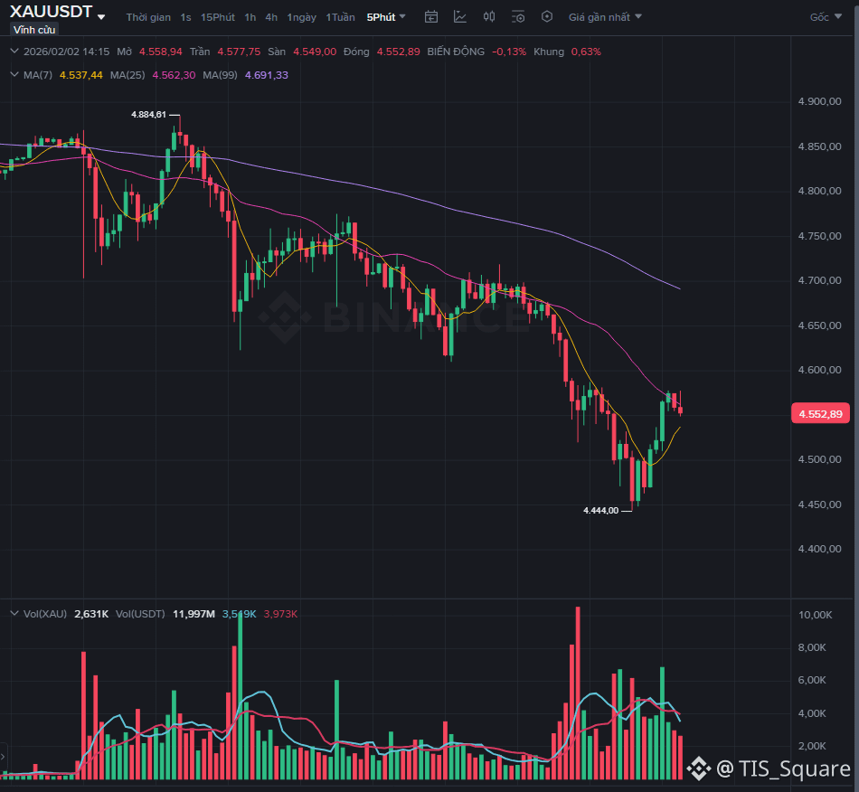 Sau khi hồi phục lên vùng $4,884, giá Vàng$XAU $PAXG đã không thể duy trì đà tăng. Một đợt Panic Sell lại kích hoạt, đẩy giá rơi tự do theo phương thẳng đứng.