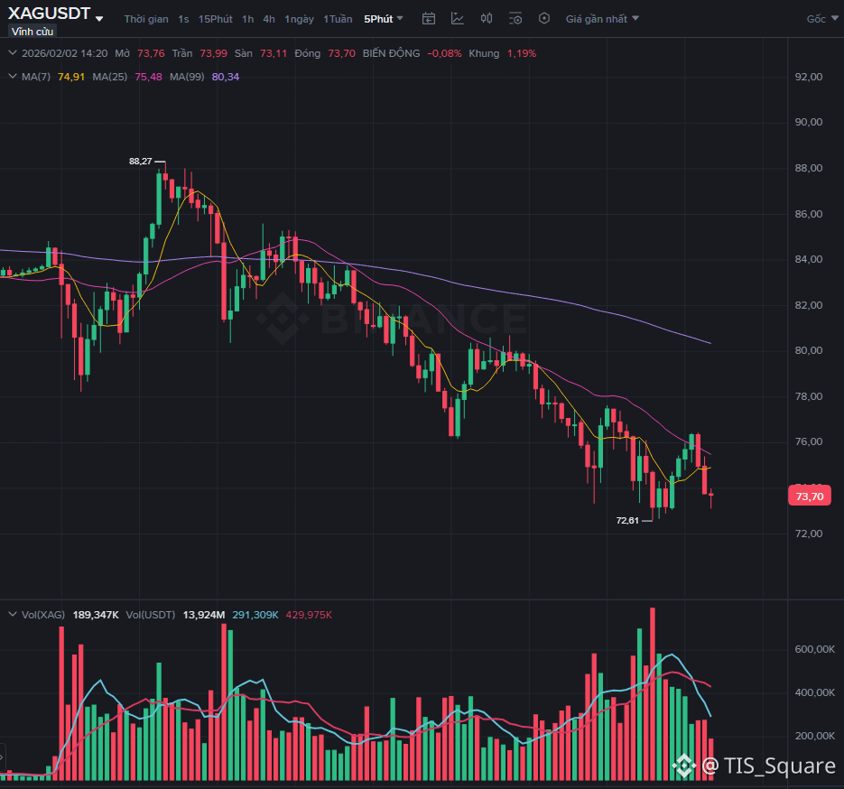 Hiện tại Bạc đang giao dịch quanh $75.02, biên độ dao động vẫn rất lớn.