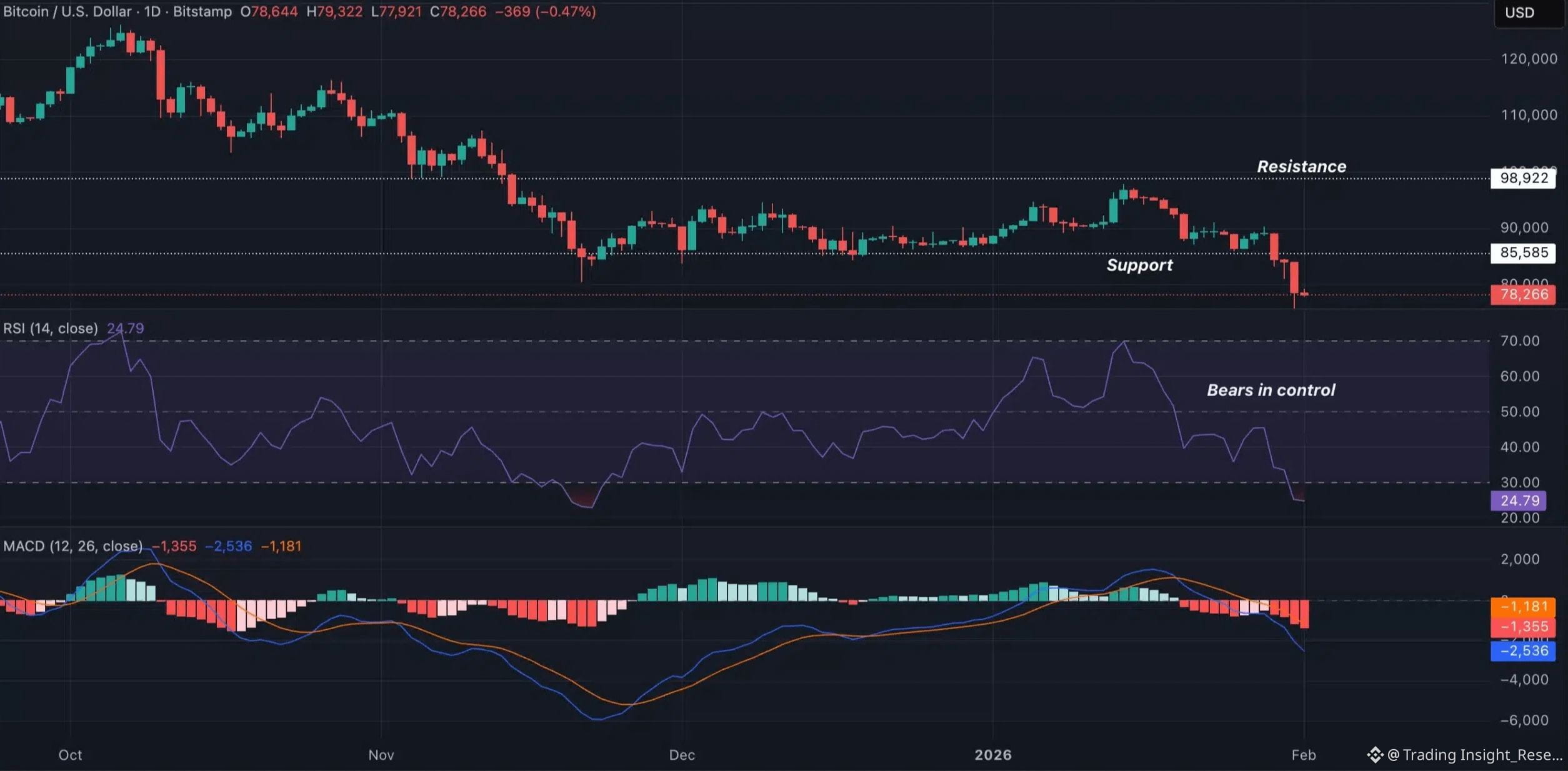 Chúng ta đã quay lại mức giá tháng 4/2025 ($78k) với RSI quá bán. Bạn sợ Bóng ma Satoshi, hay đang định vị cho tương lai $200k được quy định pháp lý của Kevin O’Leary?
