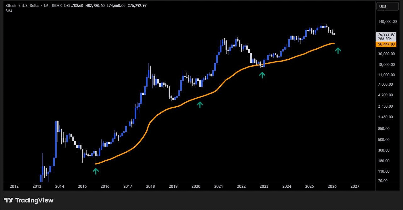 Một trong những chỉ báo bị bỏ qua nhưng có sức mạnh lịch sử trong cấu trúc thị trường Bitcoin đang tiếp cận lần nữa: Trung bình Động Đơn Giản 300 tuần, hiện đang ở khoảng $50,000.