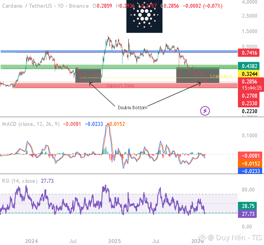 Mốc $0.267 hiện tại là chốt chặn quan trọng nhất. Nếu giữ được mốc này, ADA có thể tạo mô hình Hai đáy và hồi lên $0.32 - $0.35 rồi tới $0.43. Nếu thủng 0.267, anh em chuẩn bị tinh thần đón ADA ở tận $0.13 nếu Bitcoin tiếp tục xấu.