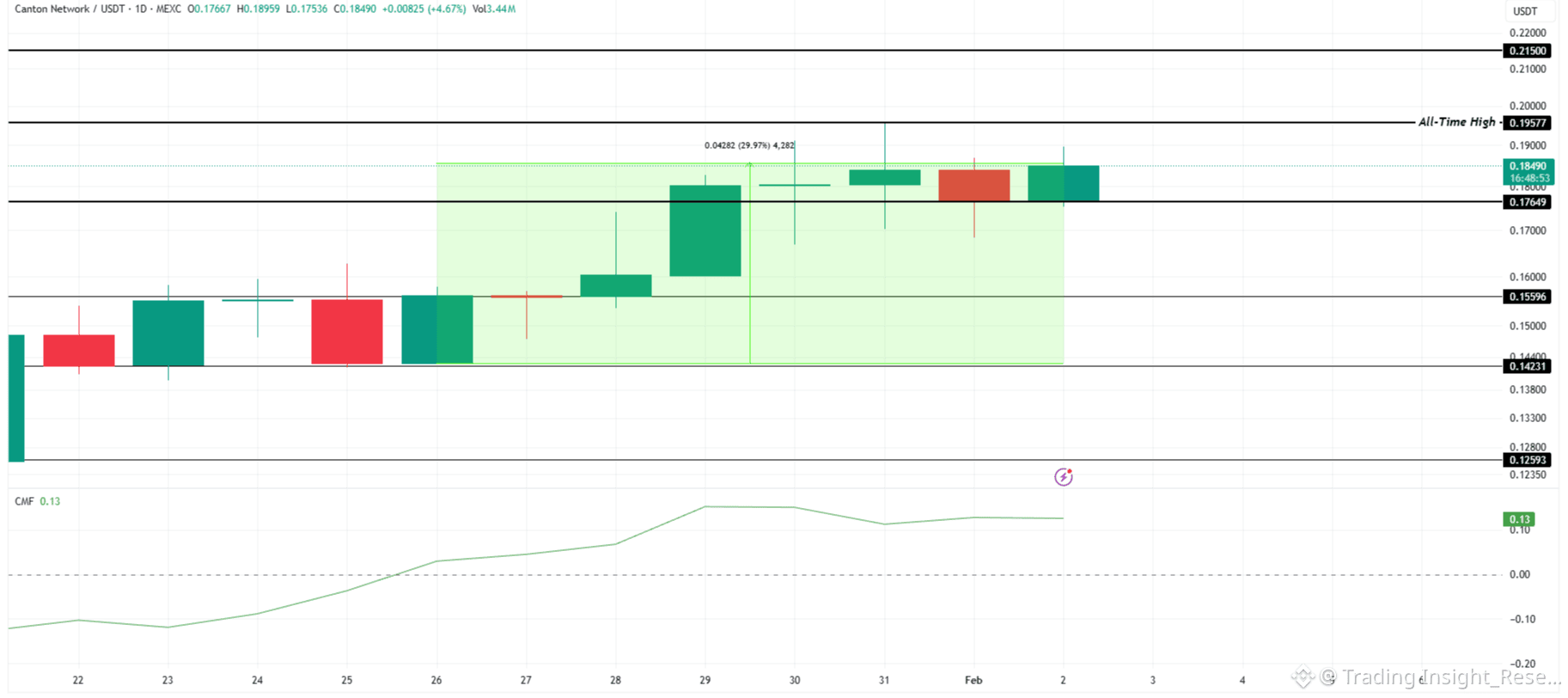 CMF dương (dòng tiền vào áp đảo). Cú đẩy vượt ATH sẽ hướng tới mục tiêu $0.215.