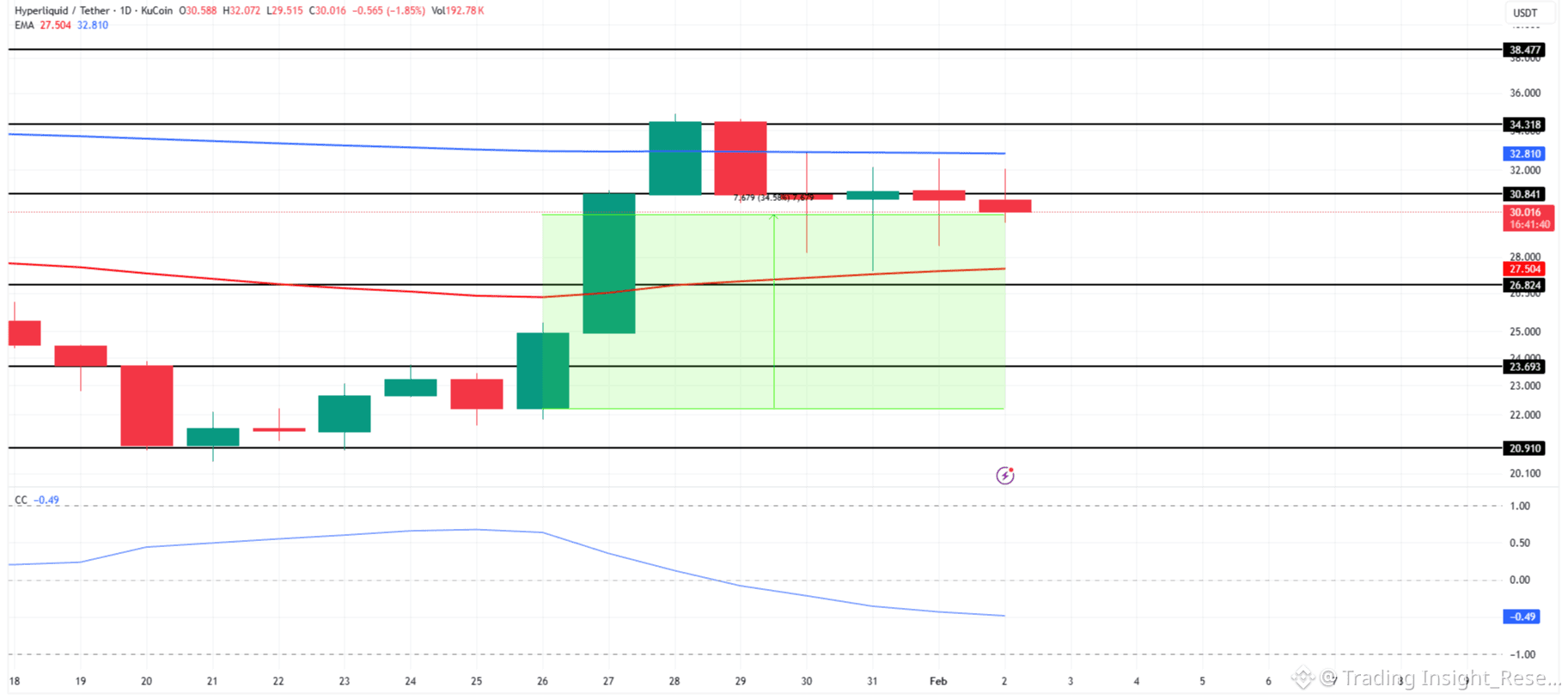 HYPE là token D.E.X duy nhất giữ sắc xanh (+34% trong 7 ngày), giao dịch quanh $30.01.