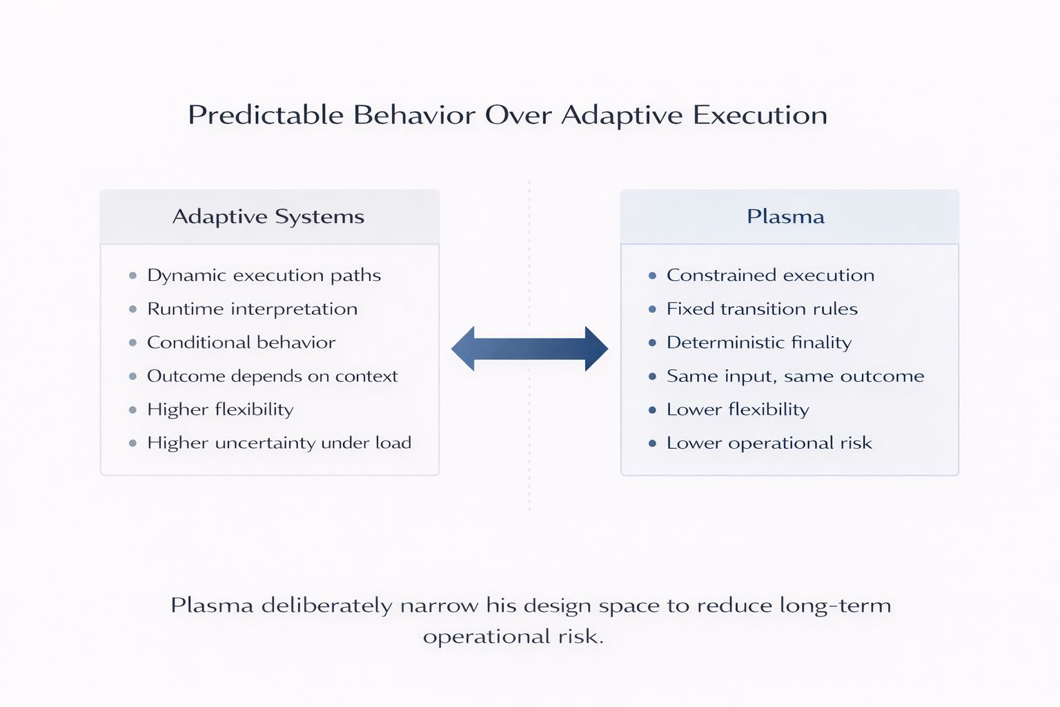 Thay vì xây dựng các cơ chế để phục hồi từ các kết quả mơ hồ, Plasma giảm số lượng các kết quả mơ hồ có thể tồn tại ngay từ đầu. Hệ thống không cố gắng trở nên thông minh sau sự kiện. Nó cố gắng trở nên tẻ nhạt vào thời điểm quan trọng.