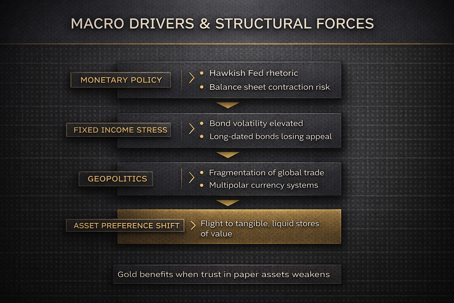 Bối cảnh địa chính trị không nên bị bỏ qua. Xung đột giữa các cường quốc hàng đầu, tái định vị các chuỗi cung ứng và chuyển hướng tới đa cực đều nói lên lợi ích của các tài sản không có biên giới quốc gia. Vàng từ lâu đã hoạt động tốt trong những thời điểm không có niềm tin vào các hệ thống tiền tệ.