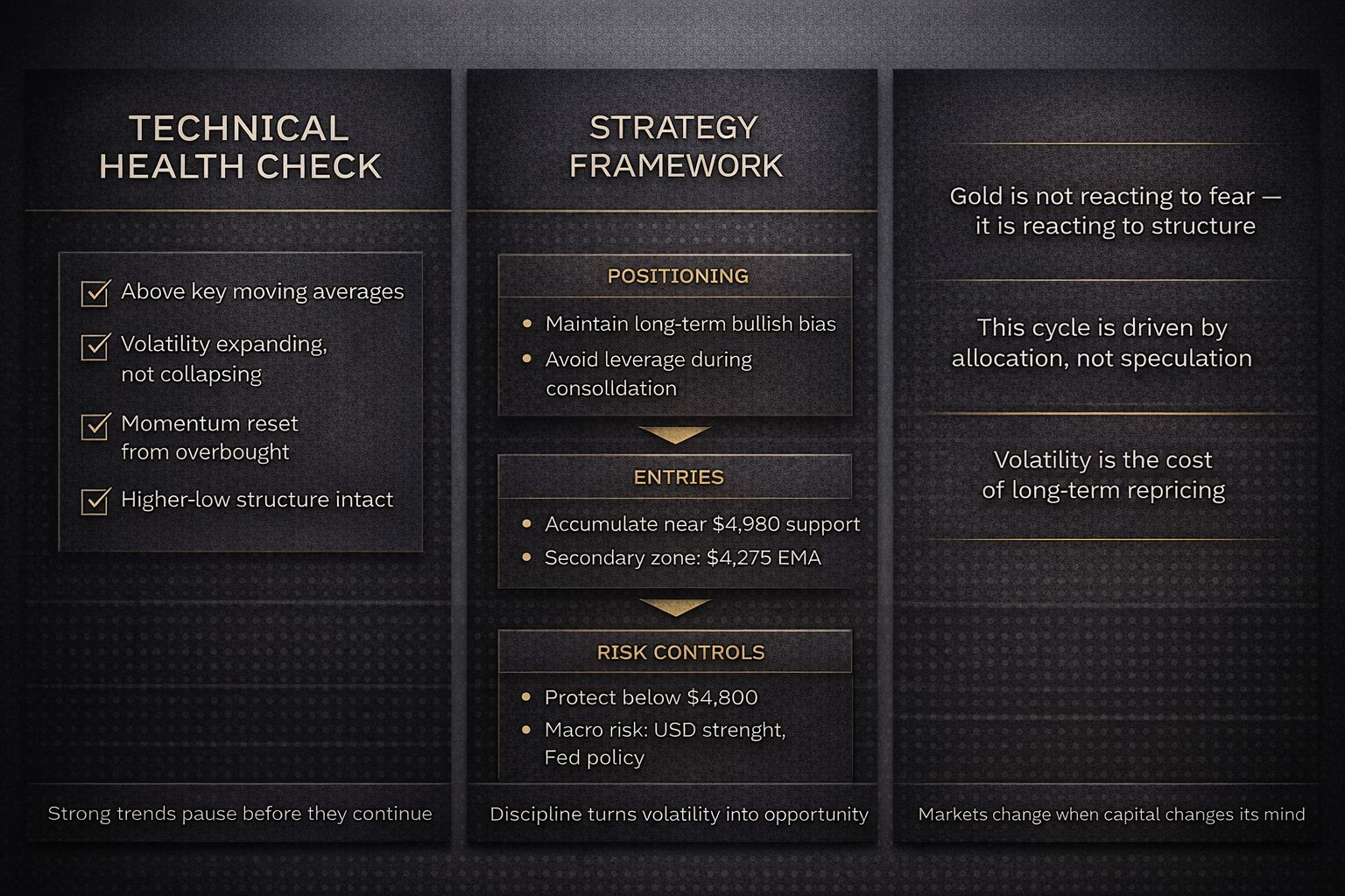 Cảm giác cũng đã thay đổi, mặc dù chỉ tạm thời. Vàng đang trở thành một công cụ phòng ngừa vĩ mô chống lại sự đàn áp tài chính, rối ren địa chính trị và rủi ro tài khóa, và một Cục Dự trữ Liên bang hiếu chiến đã mở ra những khó khăn trong ngắn hạn, nhưng câu chuyện cơ bản vẫn như cũ: vàng đang được coi như một công cụ phòng ngừa vĩ mô. Các giai đoạn hợp nhất, thay vì thay đổi xu hướng dài hạn, do đó, có khả năng được coi là các đợt điều chỉnh. Nhu cầu kỷ lục vào năm 2025 cho thấy rằng bất kỳ đáy nào cũng là một điểm cộng cho người mua. Nói đơn giản, sự biến động tương đương với chi phí của sự tham gia dài hạn.