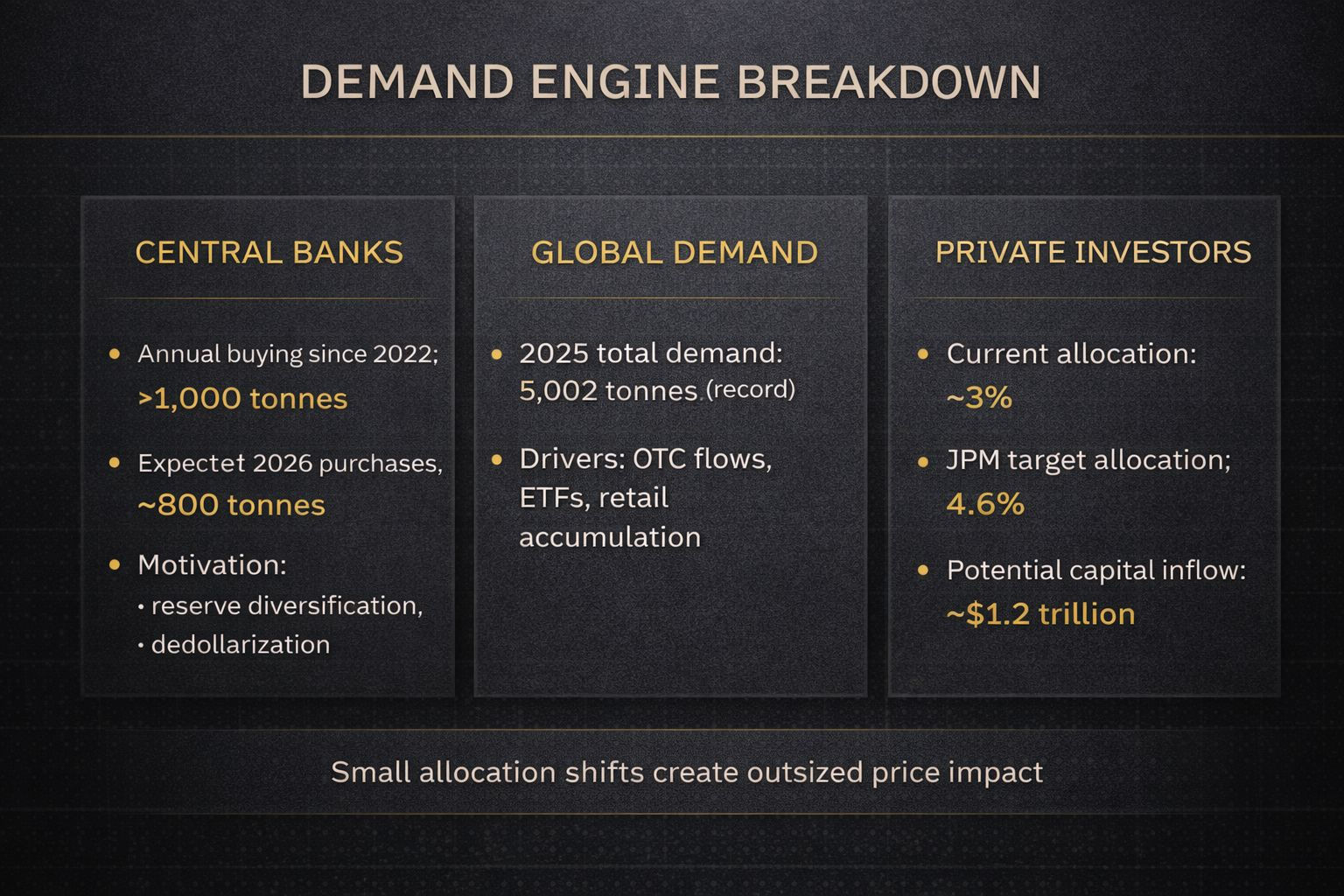 Một trong những thành phần quan trọng nhất của triển vọng là hành vi của ngân hàng trung ương. Các ngân hàng trung ương được dự đoán sẽ tăng cường mua vàng lên 800 tấn vào năm 2026 sau khi đã mua hơn 1 000 tấn trong ba năm qua. Điều này đã duy trì thông tin tích lũy về một xu hướng giảm đô la cấu trúc, nơi mà các quốc gia đang đa dạng hóa dự trữ ra ngoài trái phiếu kho bạc Hoa Kỳ. Nó cũng làm giảm nguồn cung vàng ra thị trường tư nhân, làm tăng ảnh hưởng giá trong trường hợp tăng nhu cầu của nhà đầu tư.