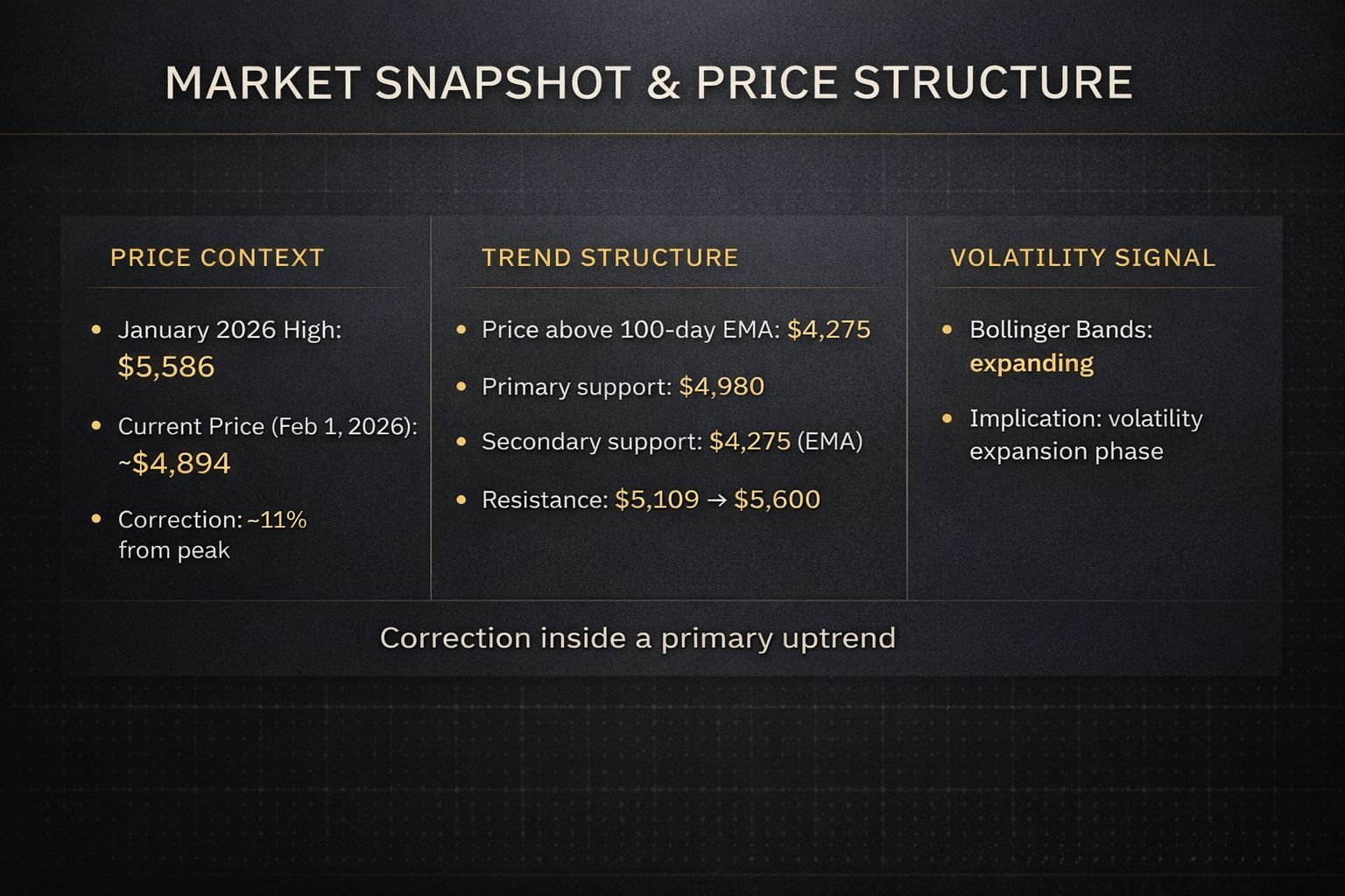 Thị trường vàng cũng đang trải qua một trong những chu kỳ thú vị nhất trong nhiều năm. Giá của kim loại quý đã trải qua một sự điều chỉnh 11 điểm phần trăm sau khi đạt mức cao nhất mọi thời đại trong giai đoạn từ tháng 1 đến khoảng 4 894 vào ngày 1 tháng 2 năm 2026. Tuy nhiên, thay vì phản ánh dấu hiệu yếu kém, các nhà phân tích diễn giải sự giảm giá này như một dấu hiệu chuẩn bị cho một hành động dài hạn hướng tới mức 8000 vào năm 2028. Cơ sở của luận điểm tăng giá là việc kết hợp ba yếu tố này, cụ thể là các tín hiệu kỹ thuật lành mạnh, các yếu tố kích thích cầu cấu trúc, và môi trường vĩ mô có lợi cho tài sản thực so với chứng khoán danh nghĩa.