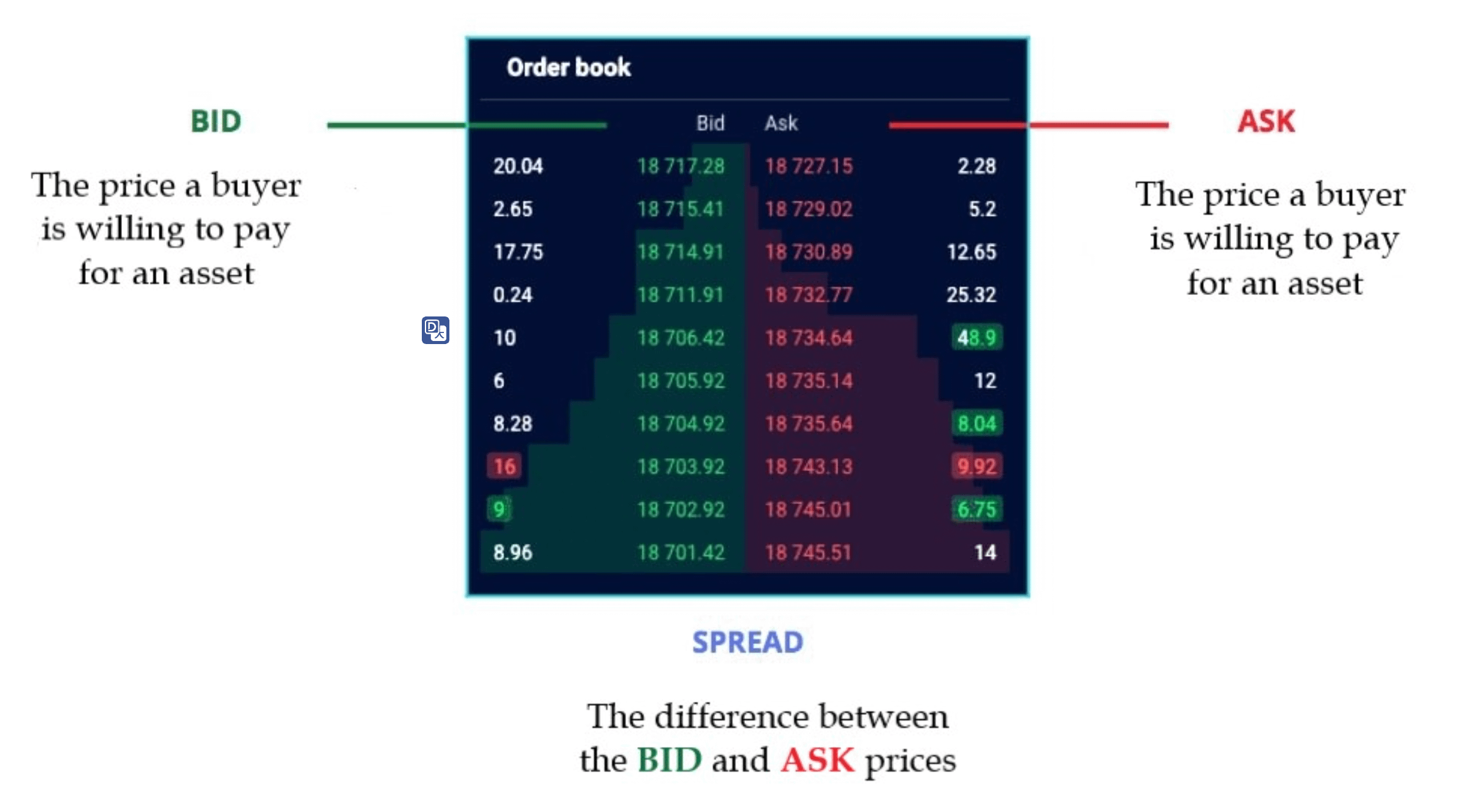 Hãy xem hình ảnh minh họa order book với bid-ask spread trong crypto để dễ hình dung.