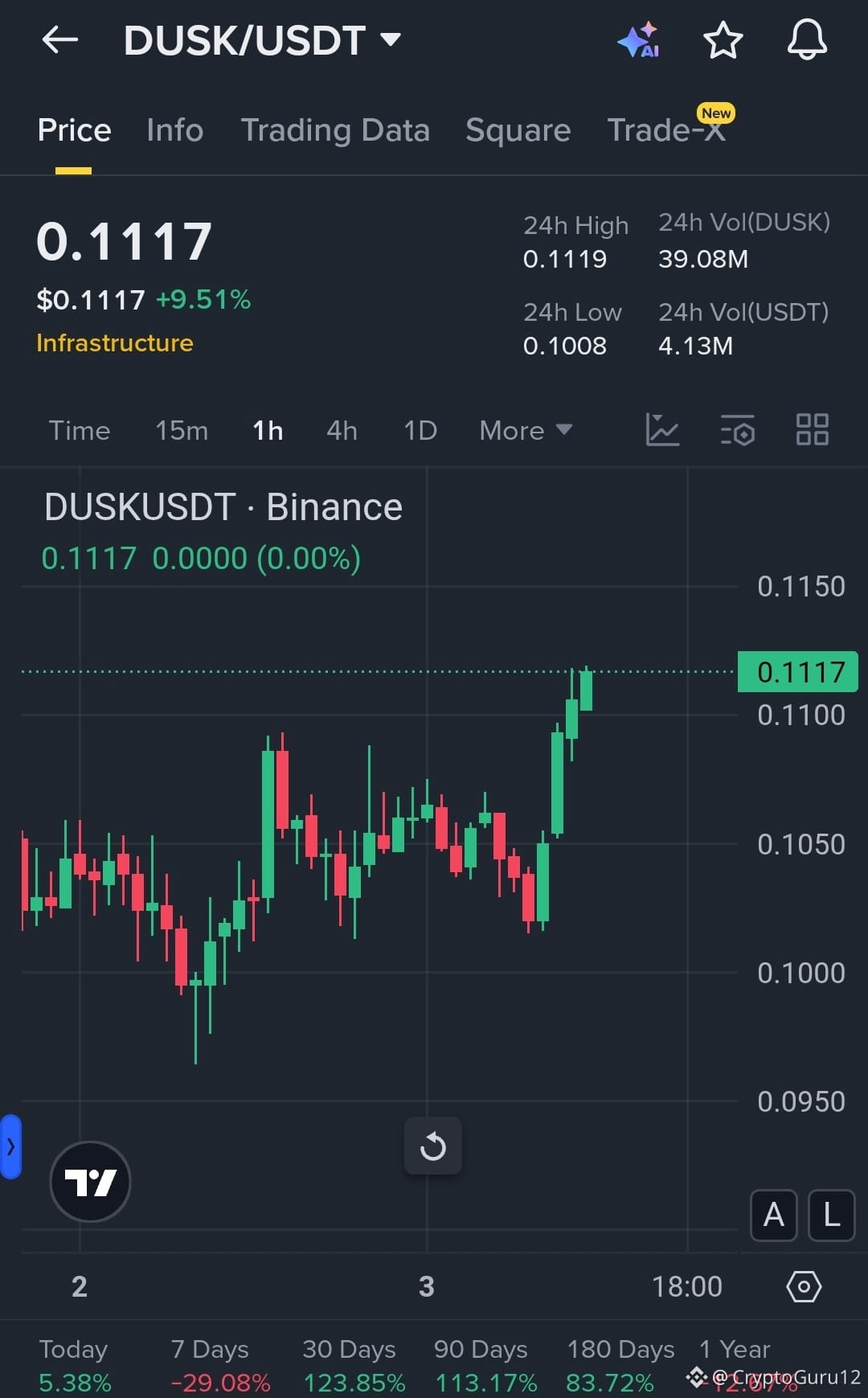 DUSK đã cho thấy một đợt tăng giá mạnh mẽ sau khi tích lũy quanh vùng hỗ trợ $0.100 đến $0.105. Động thái mạnh mẽ trên khung thời gian 1H cho thấy sự quan tâm mua mới và sự chuyển biến trong động lực ngắn hạn. Giá hiện đang giao dịch gần mức cao địa phương, cho thấy tiềm năng tiếp tục nếu sức mạnh được giữ.