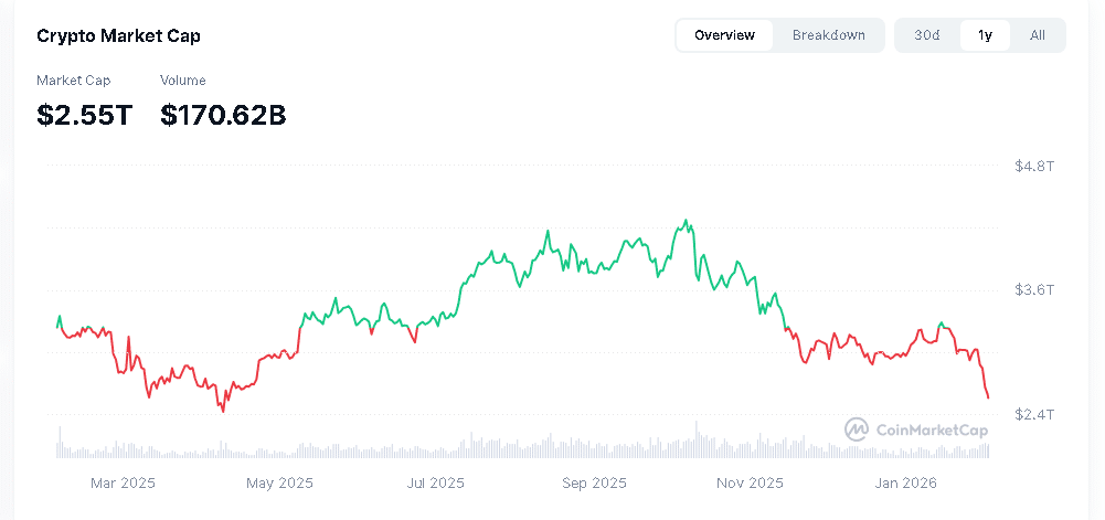 Từ quy mô tổng thể, tổng giá trị vốn hóa của thị trường tiền điện tử đã giảm xuống còn khoảng 2.55 triệu tỷ USD, so với đầu năm 2025 đã giảm rõ rệt, cũng gần với mức đáy tạm thời vào tháng 4.