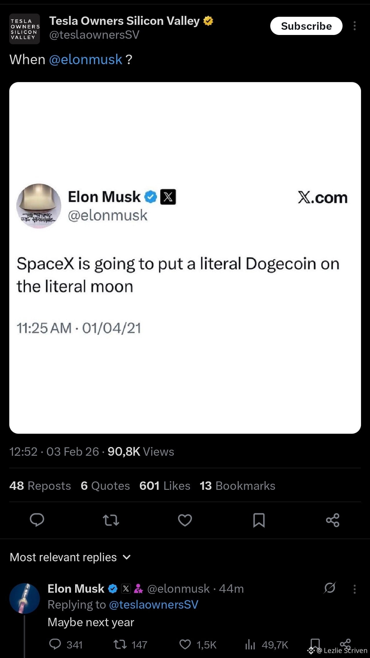 🗣️ Elon Musk reply đầu 2026: “Maybe next year” khi được hỏi về DOGE-1. Không xác nhận, không phủ nhận, nhưng đủ gây sóng.