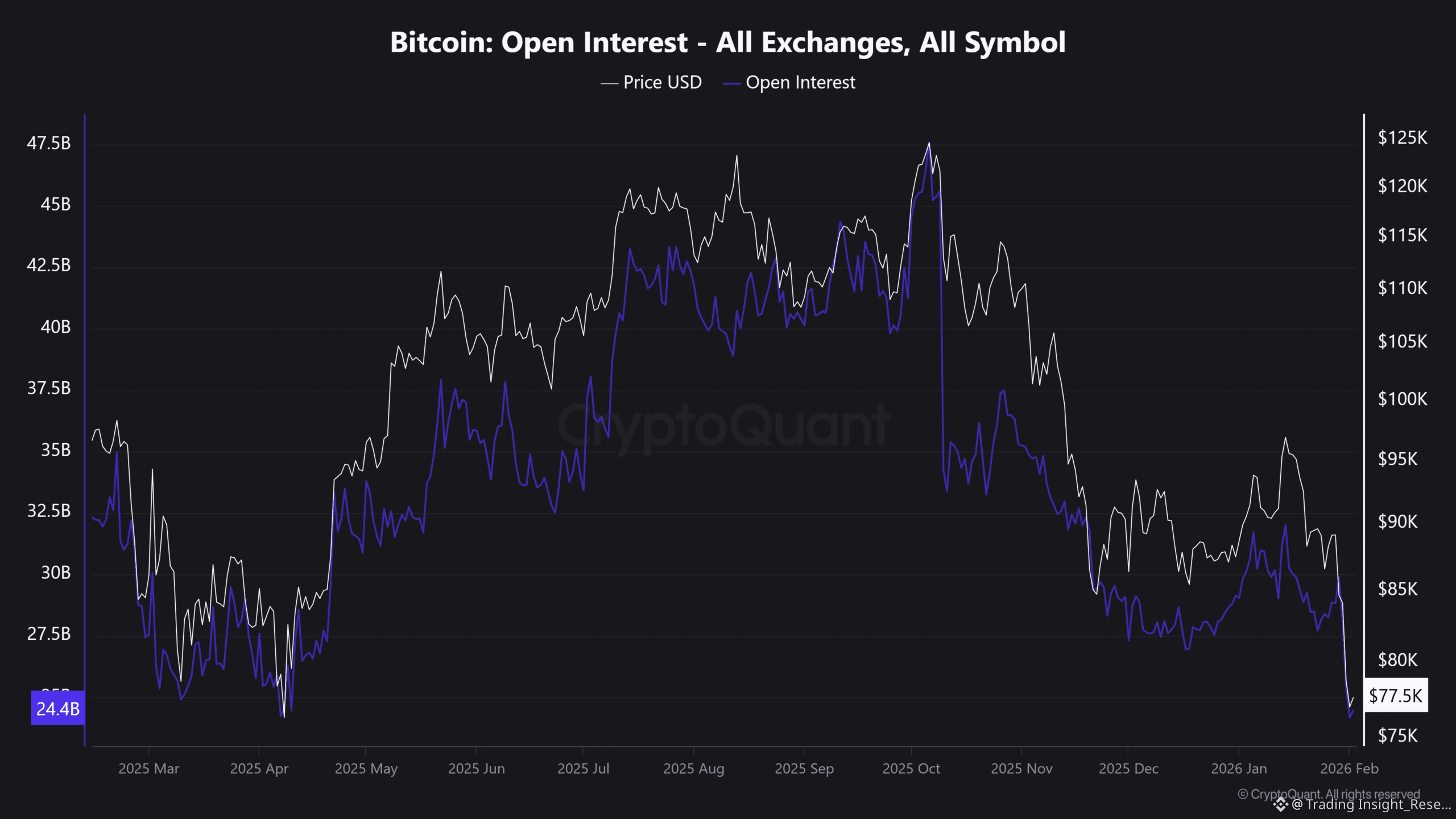 Hợp đồng mở (OI) đã lao dốc không phanh từ 47.5 Tỷ USD xuống còn 24.4 Tỷ USD. Bong bóng đòn bẩy thực chất đã giảm đi một nửa.
