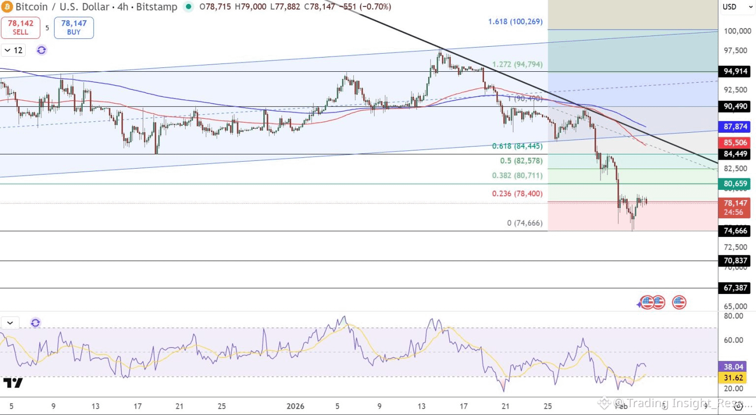 BTC đang kiểm định mức Fibonacci 0.236 tại $78,400. Giữ vững mức này là bắt buộc để tránh test lại $74,666.