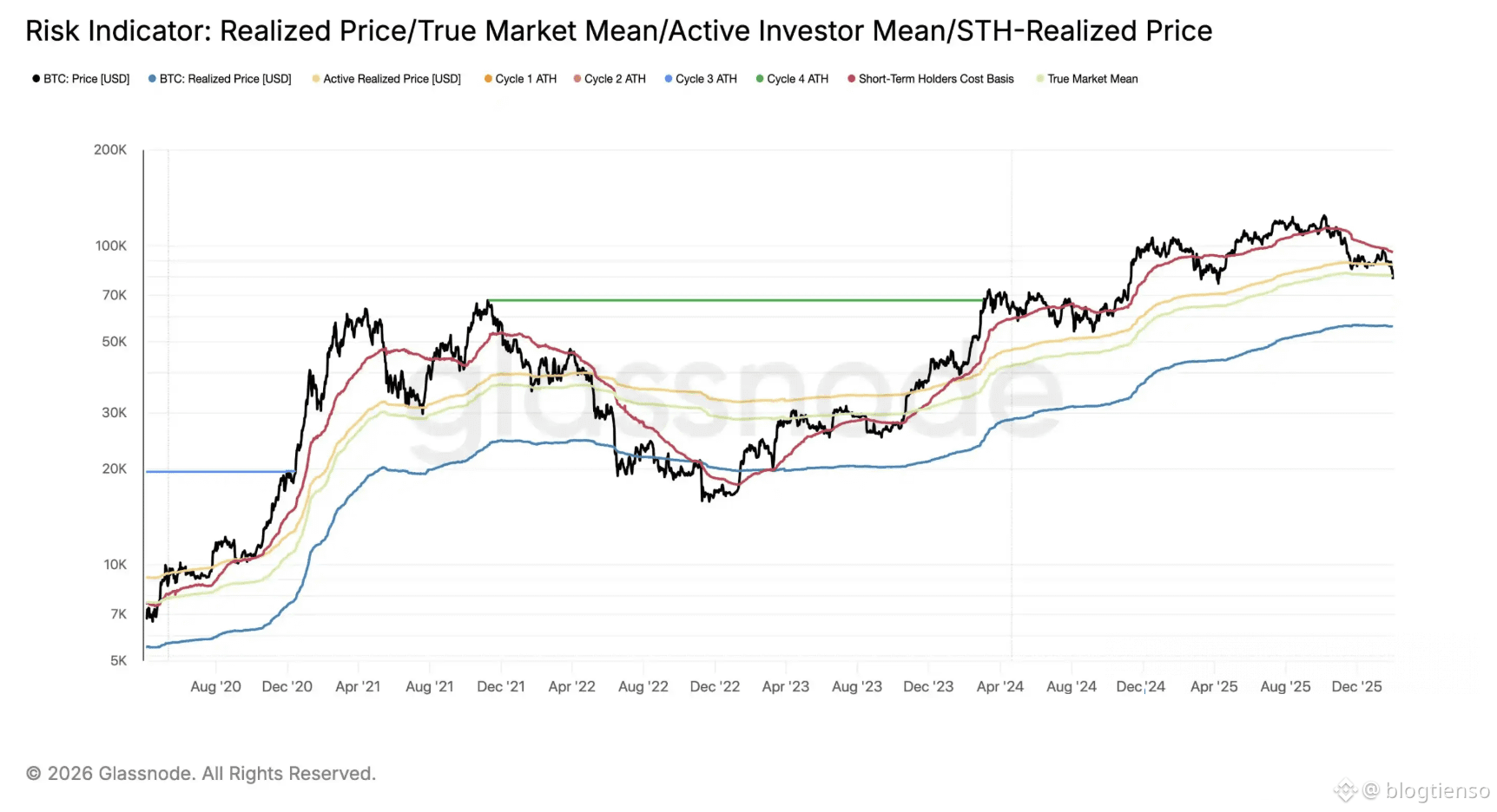 Giá Bitcoin đã giảm xuống dưới 78.000 đô la. Glassnode đã cập nhật phân bổ giá trên chuỗi của Bitcoin như sau: Giá vốn của STH (Người nắm giữ ngắn hạn), phản ánh giá nắm giữ trung bình của người mua/giao dịch mới trong những tháng gần đây, là 95.400 đô la.