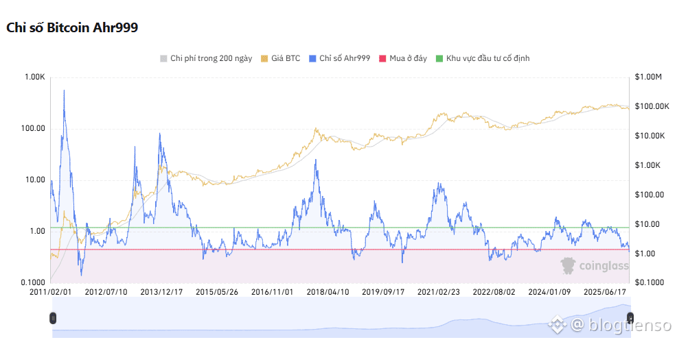 Chỉ báo ahr999, được phát minh cách đây nhiều năm bởi người dùng Weibo ahr999, được sử dụng để đánh giá sự chênh lệch giữa lợi nhuận ngắn hạn và giá Bitcoin. Công thức là (giá hiện tại / chi phí bình quân giá 200 ngày) × (giá hiện tại / định giá tăng trưởng theo cấp số mũ), trong đó định giá tăng trưởng theo cấp số mũ dựa trên đường cong phù hợp của giá lịch sử và chiều cao khối, đại diện cho "giá trị hợp lý" dài hạn. Kinh nghiệm lịch sử cho thấy: ahr999 < 0,45 cho thấy vùng mua ở giá thấp; 0,45-1,2 là phù hợp cho việc bình quân giá; và > 1,2 cho thấy vùng giá cao.