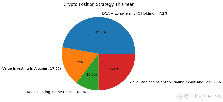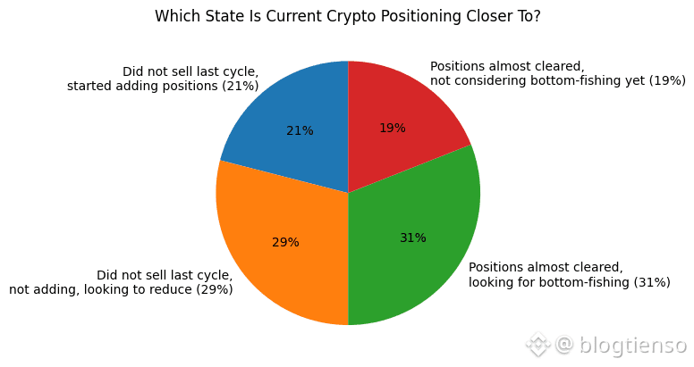Hiện tại, trong số những người tham gia khảo sát, 31% cho biết họ gần như đã thanh lý hết các vị thế của mình nhưng vẫn đang tìm kiếm cơ hội mua vào ở mức giá đáy. 29% cho biết họ không bán bất kỳ khoản đầu tư nào trước đây nhưng hiện tại không mua thêm và muốn tìm cơ hội để giảm bớt lượng đầu tư. 21% cho biết họ không bán bất kỳ khoản đầu tư nào trước đây và đã bắt đầu mua thêm.