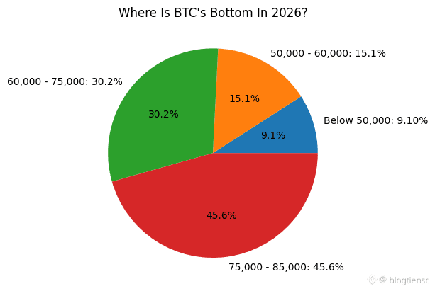 Một cuộc thăm dò ý kiến (1189 người tham gia) cho thấy đa số người được hỏi (45,6%) tin rằng giá đáy của BTC vào năm 2026 sẽ nằm trong khoảng từ 75.000 đến 85.000 đô la. 30,2% số người được hỏi còn lại tin rằng giá đáy sẽ nằm trong khoảng từ 60.000 đến 75.000 đô la.