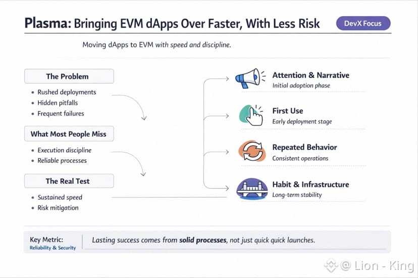 Plasma is framed around a fairly straightforward ambition: move EVM dApps over faster, with less risk. It sounds like a tagline, but I look at the path, not the destination. In crypto, speed often comes with technical debt, and “less risk” is often just a fresh coat of paint, because the real risk sits where nobody talks about it, inside process, discipline, and how a team protects itself from repeating the same failures. Maybe what’s interesting about Plasma is that it treats DevX as something that can compound over time, instead of tooling being an afterthought added for appearances.