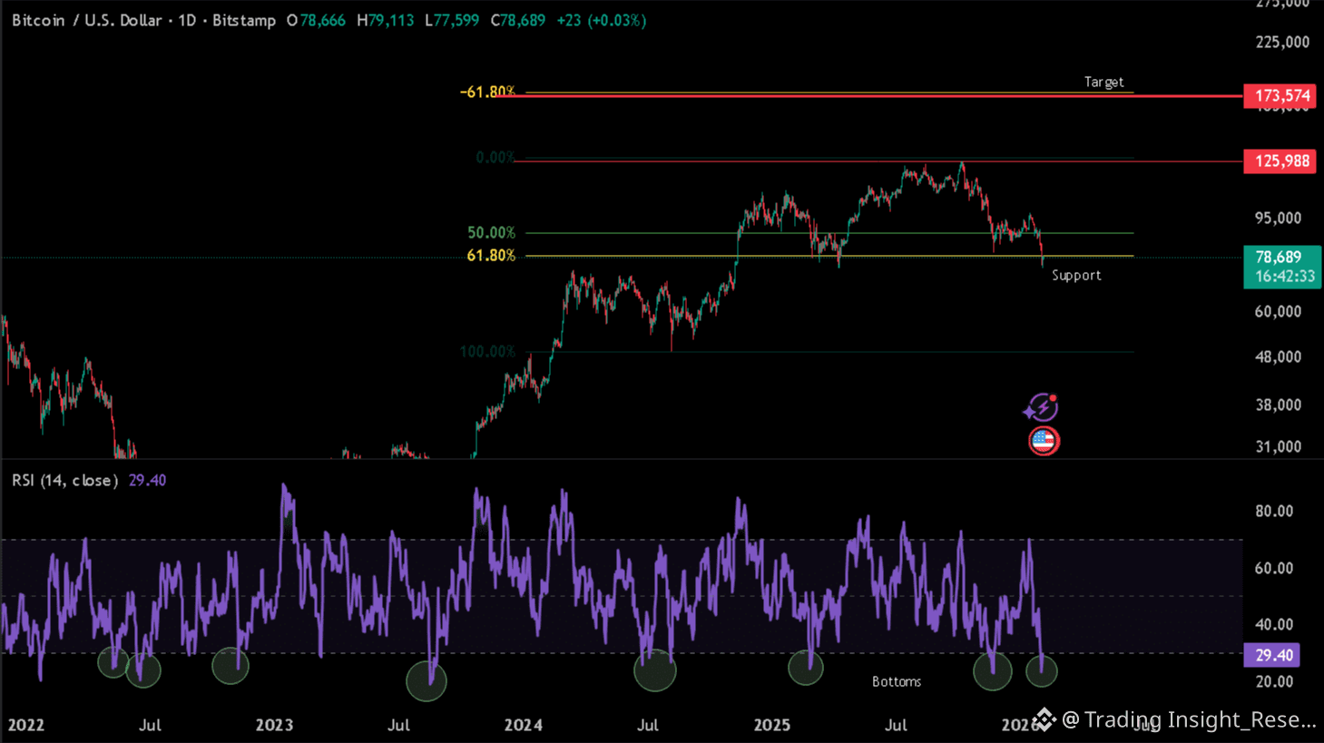 RSI đang ở mức tương đồng với các vùng đáy thị trường trong quá khứ, nơi BTC thường bật tăng mạnh mẽ.
