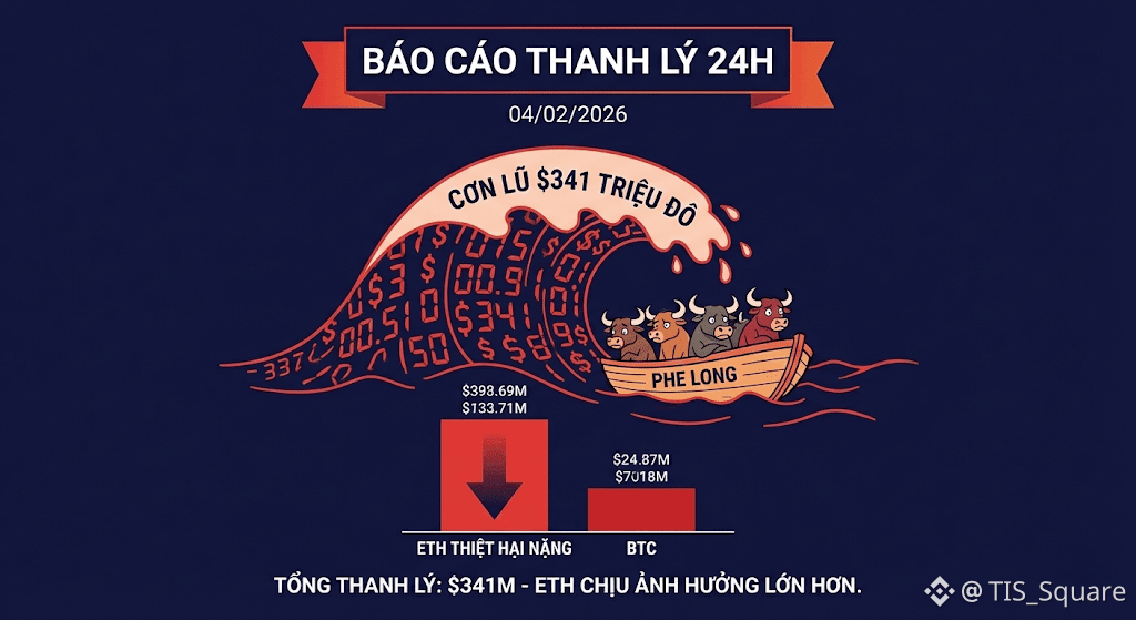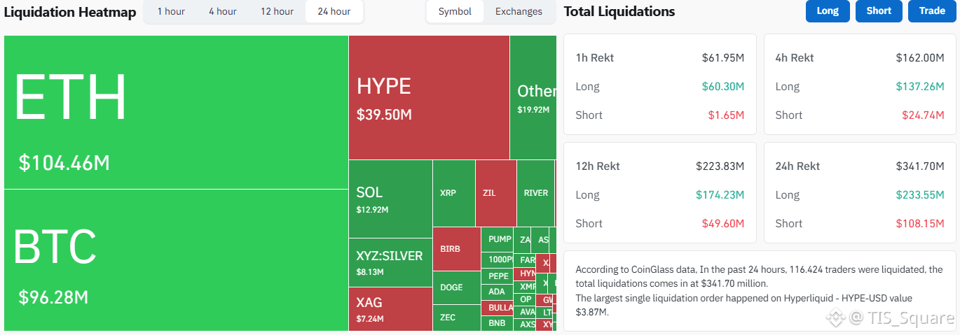 Tổng thanh lý 24h: Con số thiệt hại ghi nhận lên tới $341.70 Triệu USD.