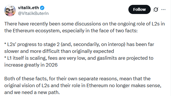 Trong một bài đăng nổi bật ngày 3 tháng 2, đồng sáng lập Ethereum Vitalik Buterin đã thẳng thắn tuyên bố rằng kỷ nguyên của Layer 2 (L2) chỉ tập trung vào "mở rộng đơn giản" đã kết thúc.
