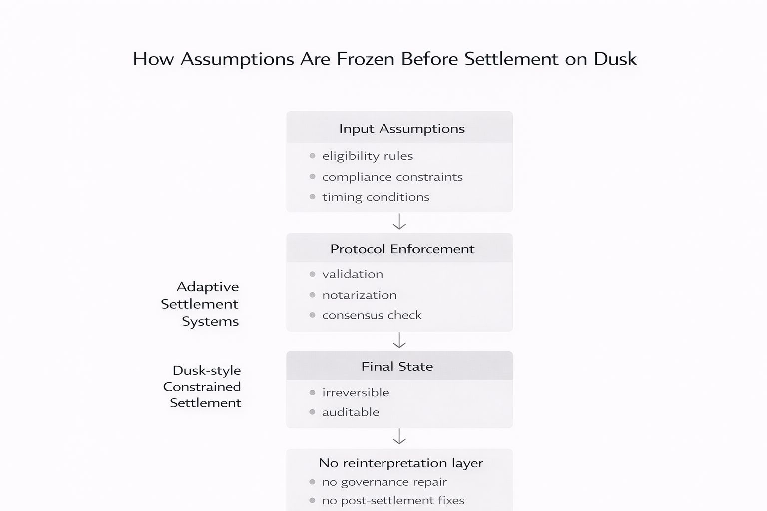 Dusk xem việc giải quyết như một đường mà không nên bị vượt qua một cách nhẹ nhàng. Không phải một trạm kiểm soát. Không phải một gợi ý. Một cam kết. Khi một trạng thái tồn tại, nó tồn tại vì hệ thống đã quyết định rằng nó nên tồn tại. Không có kỳ vọng rằng ý nghĩa sẽ được thương lượng sau này thông qua quản trị, đồng thuận xã hội, hoặc giải thích hậu kỳ.