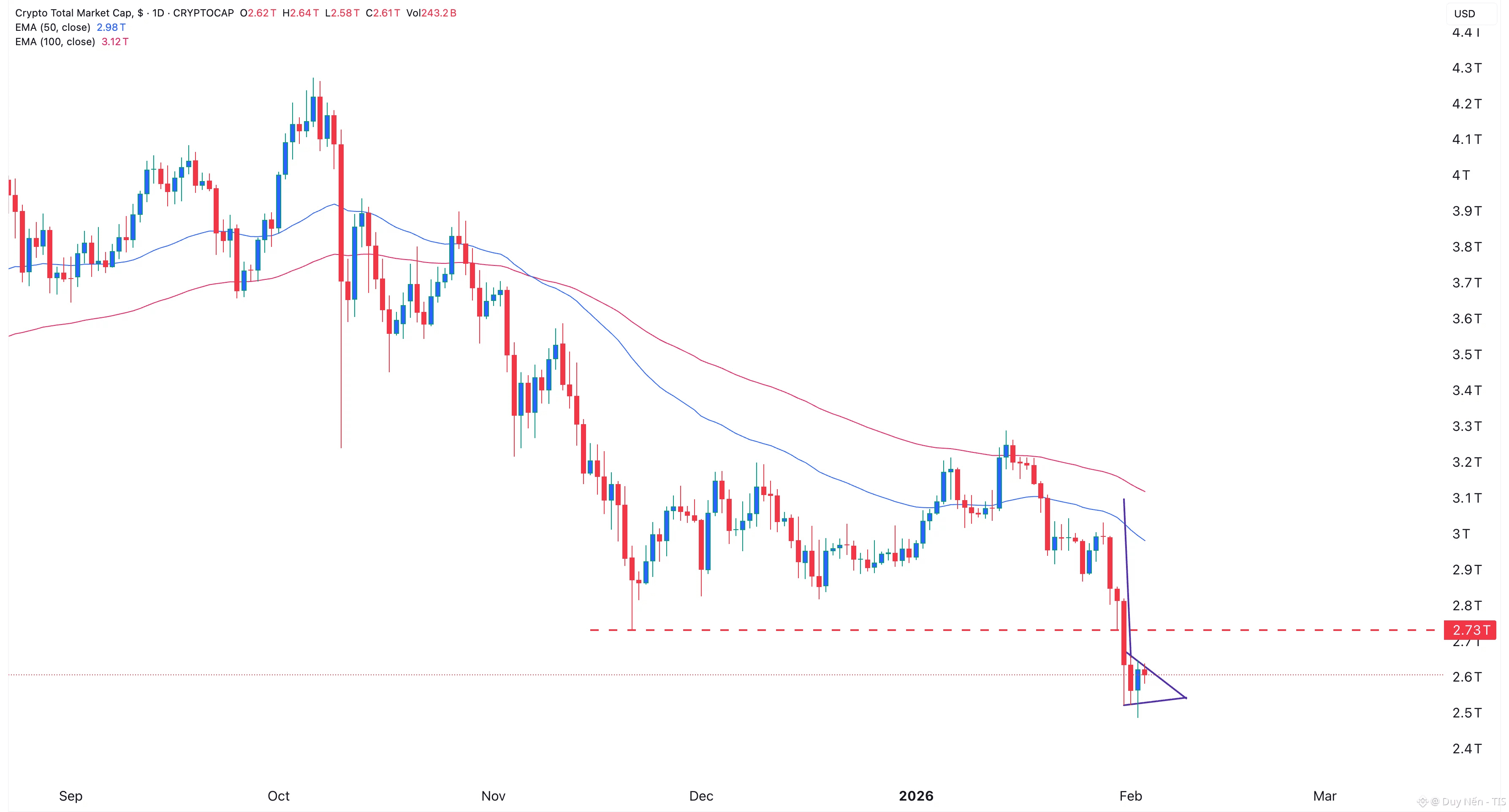 Vốn hóa toàn thị trường vẫn nằm dưới các đường EMA 50 và 100, đồng thời chưa lấy lại được mốc hỗ trợ cứng 2.7 nghìn tỷ đô.
