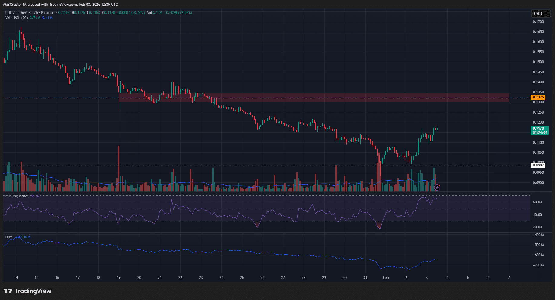 Hiện tại, đà phục hồi của POL có thể kéo dài đến 0.1325 USD, đây là mức hỗ trợ khá quan trọng trong vài tuần qua. Đồng thời, vùng cung 0.13 USD cũng là khu vực mà bên bán có thể hành động trong ngắn hạn. Các nhà giao dịch ngắn hạn có thể theo dõi chặt chẽ mức này. Nếu giá giữ vững trên 0.13 USD, có khả năng sẽ tiếp tục tăng lên 0.186 USD. Nhưng trước khi Bitcoin phá vỡ mức kháng cự địa phương, khả năng POL tiếp tục tăng không cao.