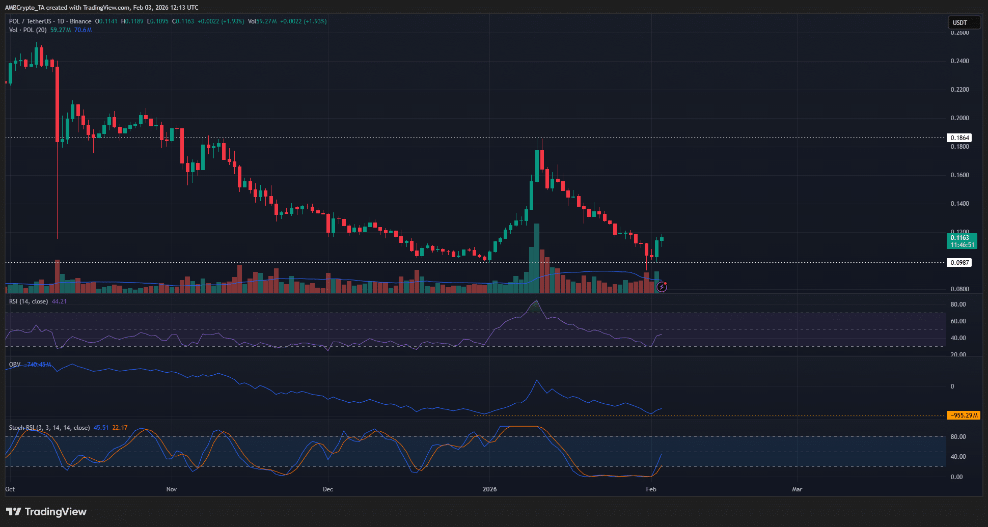 Đối với các nhà đầu tư dài hạn, việc POL giữ vững mức hỗ trợ tâm lý 0.1 USD là điều đáng khích lệ. Nhưng các nhà giao dịch ngắn hạn có thể cần kiên nhẫn, chờ đợi giá phá vỡ mức quan trọng trước khi hành động. Nếu POL lại giảm xuống dưới 0.1 USD, thì sự giảm giá có thể mang lại cơ hội bán; nếu phá vỡ 0.13 USD, thì trong ngắn hạn có cơ hội phục hồi lên 0.186 USD.