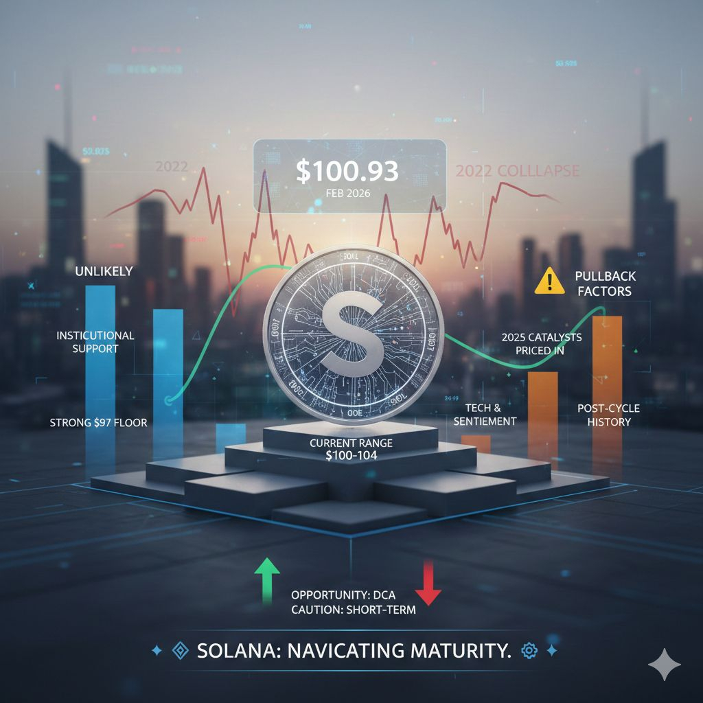 Solana ($SOL) một lần nữa đang ở trung tâm của cuộc tranh luận trên thị trường. Tính đến tháng 2 năm 2026, SOL đã giảm hơn 5% so với đỉnh cao năm 2025 gần $106, hiện đang giao dịch trong khoảng $100–$104 (mới nhất khoảng $100.93).
