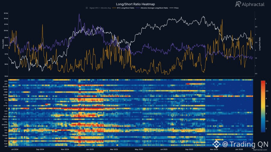 👀 Tuy nhiên, chi tiết đáng lo nhất lại nằm ở Bitcoin. Trong khi altcoin cũng được Long, thì cường độ Long của BTC vượt trội rõ rệt, cho thấy dòng tiền đang co cụm và tập trung vào BTC như một “phao an toàn”. Đây thường không phải dấu hiệu của một thị trường khỏe mạnh, mà là biểu hiện của tâm lý phòng thủ trá hình: nhà đầu tư sợ rủi ro, nhưng vẫn không chấp nhận kịch bản thị trường giảm, nên chọn BTC và… dùng đòn bẩy.