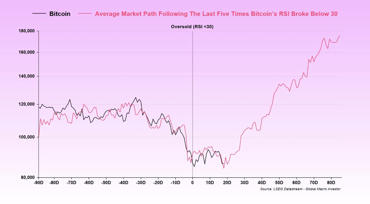 Điều này cho thấy quỹ đạo trung bình của BTC theo sau một chỉ số RSI bán quá mức, với RSI giảm xuống dưới 30 tại t=0.
