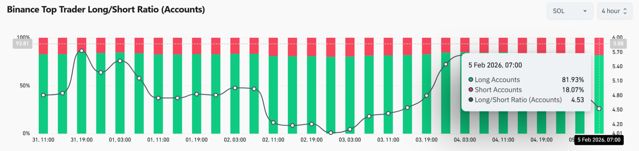 🔶Điều đáng lo ngại là cá voi này đang đi ngược lại hoàn toàn với đám đông. Dữ liệu cho thấy 82% tài khoản top trader trên Binance vẫn đang gồng Long, đẩy tỷ lệ Long/Short lên mức báo động 4.5. Khi đám đông say máu bắt đáy trong xu hướng giảm, rủi ro xảy ra một cú Long Squeeze là cực cao.