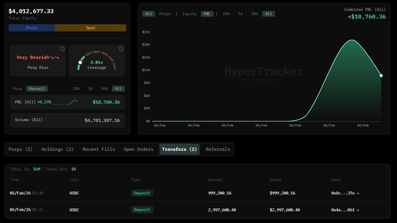 🔶Một ví mới toanh vừa nạp nóng 4 triệu $USDC lên sàn Hyperliqud và mở ngay lệnh Short $SOL với đòn bẩy 3x. Hành động dùng đòn bẩy vừa phải này cho thấy cá mập rất tự tin vào kịch bản giảm giá chứ không đơn thuần là hedging.
