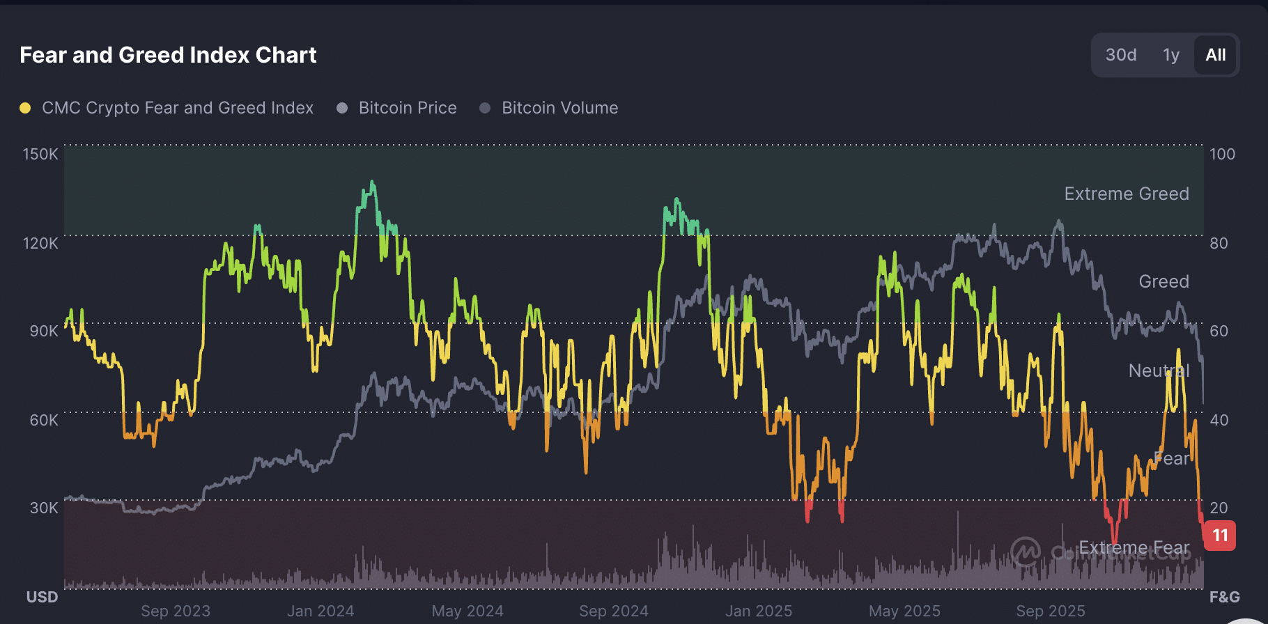 Tâm lý thị trường Crypto đã sụp đổ vào vùng Sợ hãi Cực độ, với Chỉ số Sợ hãi và Tham lam chạm mốc 11 một trong những mức thấp nhất kể từ cuối năm 2023. Đây không chỉ là sự hoảng loạn của nhỏ lẻ dữ liệu tổ chức xác nhận một đợt tháo chạy rủi ro (risk-off) quy mô lớn.