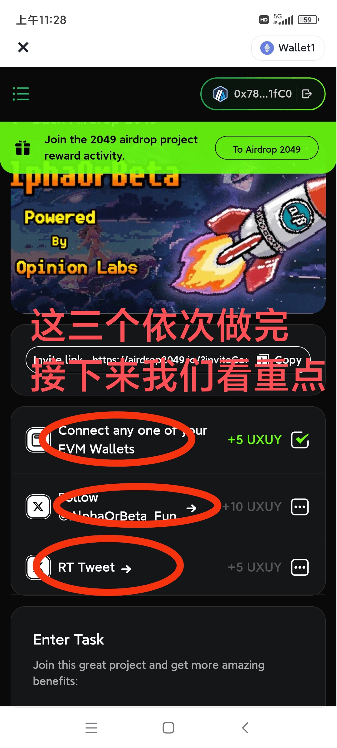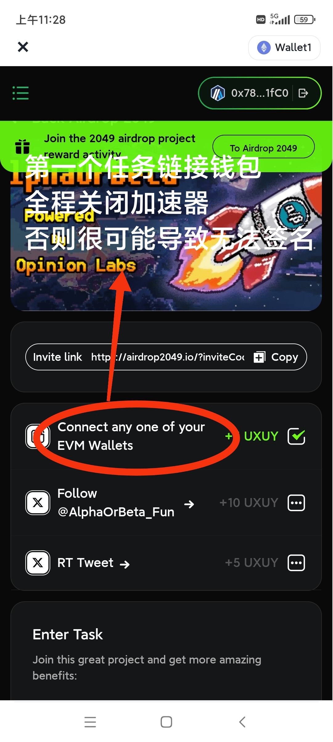 Bước đầu tiên là mở ví Binance web3, mở giao diện tác vụ Uxlink và kéo xuống.