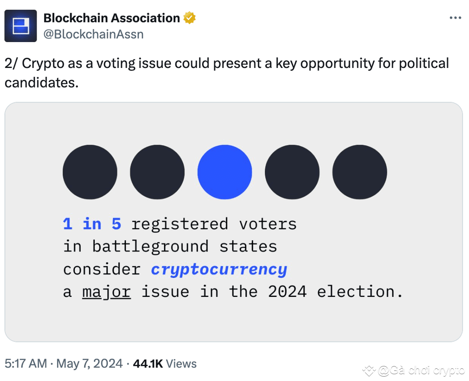 Đầu tháng này, một cuộc thăm dò của Hội đồng tiền điện tử quốc gia ở Hoa Kỳ đã chỉ ra rằng cuộc bỏ phiếu về tiền điện tử có thể là vấn đề quan trọng trong việc quyết định cuộc bầu cử sắp tới. Khoảng 8 trong số 10 người được hỏi cho rằng quan điểm của ứng cử viên về vấn đề tiền điện tử và ít nhất là “quan trọng” đối với lá phiếu của họ, trong khi 83% đại đa số cử tri về tiền điện tử nói rằng họ thích một ứng cử viên “muốn viết các quy tắc rõ ràng về tiền điện tử để các nhà đầu tư có thể có thể tiếp tục có nhiều lựa chọn và ngành này có thể tiếp tục phát triển và tạo việc làm.”