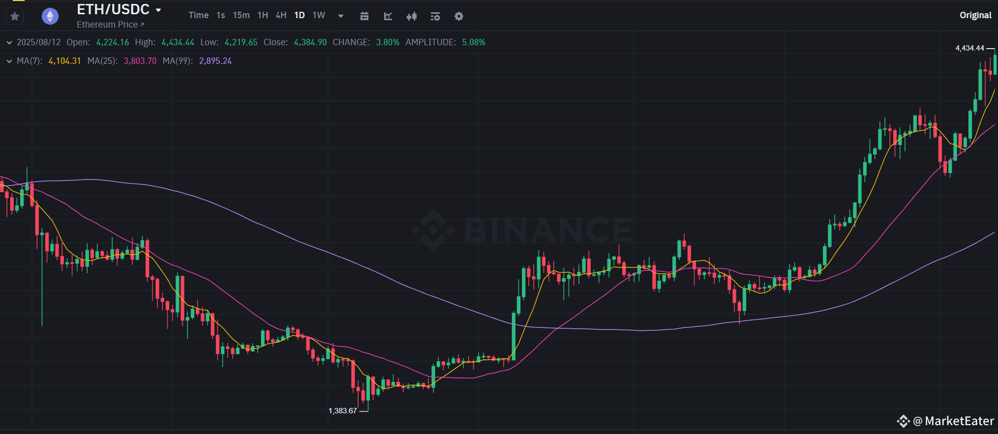 Technical Breakout – ETH surged to $4,405.71 with high volume, breaking above its Bollinger Bands. The 7-period EMA crossed above the 25-period EMA, and MACD confirmed bullish momentum, indicating strong upward potential.