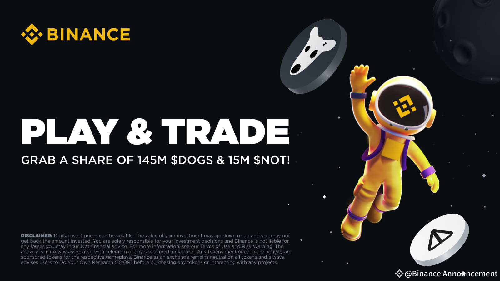 Binance is excited to launch our first-ever promotion for Moonbix — our Telegram Mini-App game! Users may complete missions during the Promotion Period to share a total of 145,000,000 DOGS and 15,000,000 NOT in token vouchers.