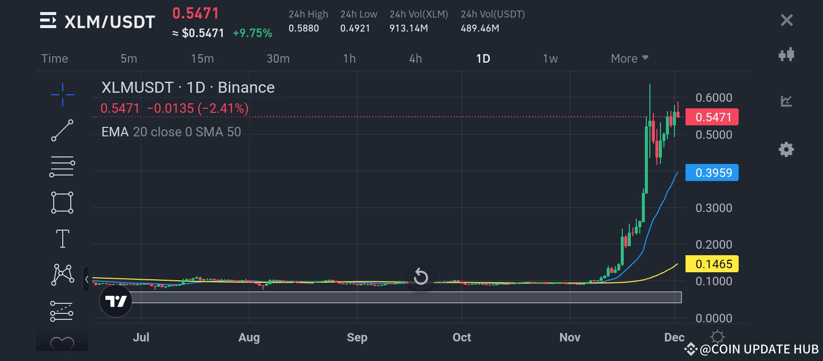 XLM formed a sharp uptrend, breaking past critical resistance levels like $0.30 and $0.50.