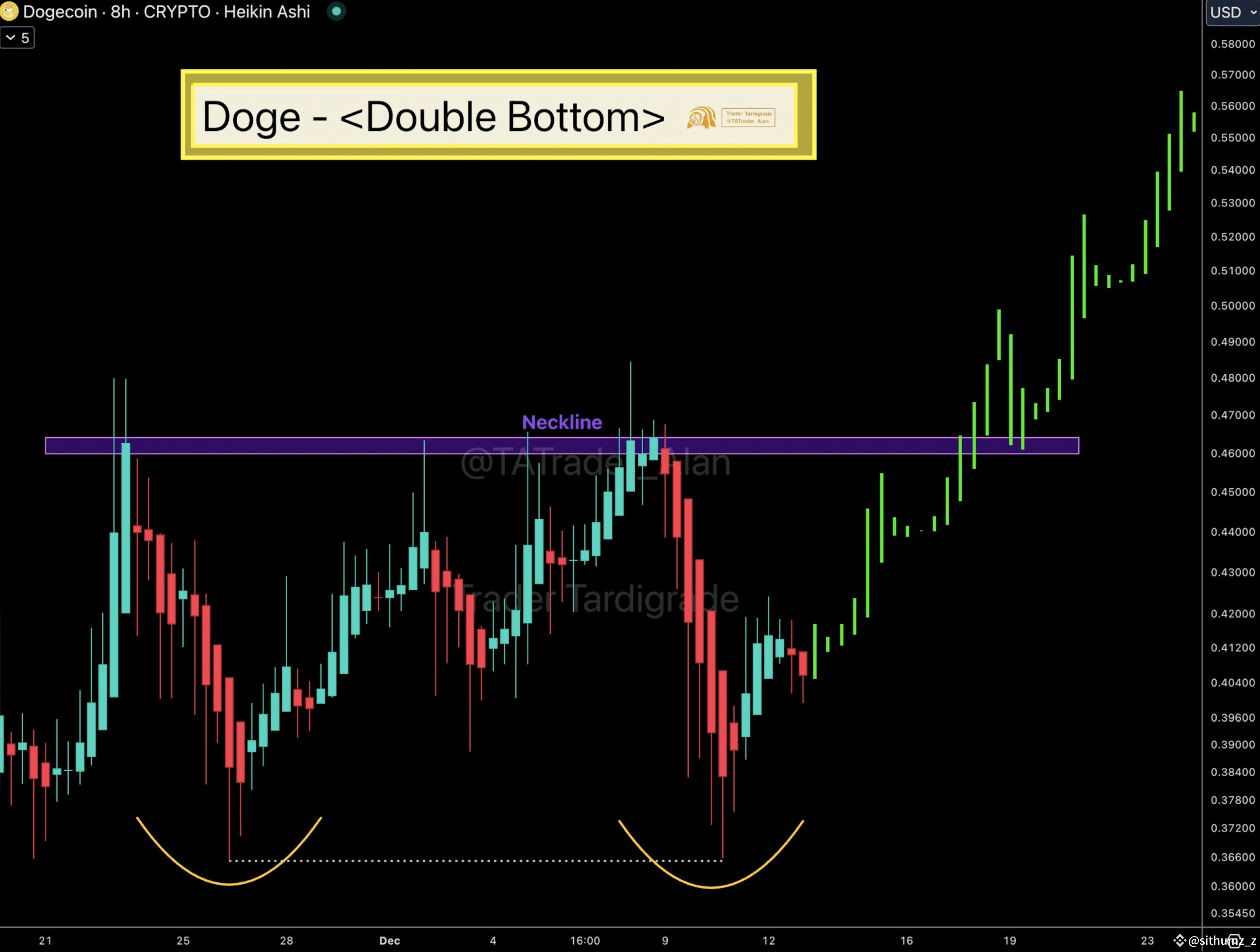 The double bottom is a famous technical chart pattern which points at the reversal of a downtrend. In the case of Dogecoin, this pattern is visible on the 8-hour chart of the asset where two distinct lows were created at the $0.37 price point. The neckline, which can be referred to as the resistance level, has been located at $0.47. What has been observed is that when the price of an asset breaks above this neckline it is considered an indication that a rally by the buyers is on the way