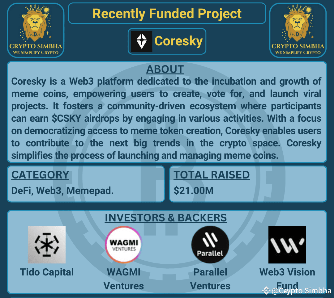 🔹About: Coresky is a Web3 platform dedicated to the incubation and growth of meme coins, empowering users to create, vote for, and launch viral projects. It fosters a community-driven ecosystem where participants can earn $CSKY airdrops by engaging in various activities. With a focus on democratizing access to meme token creation, Coresky enables users to contribute to the next big trends in the crypto space. By integrating innovative tools and resources, Coresky simplifies the process of launching and managing meme coins, making it accessible to a broader audience. Its user-friendly interface and robust infrastructure ensure seamless participation for both creators and investors. Coresky also emphasizes transparency and community engagement, building trust within its ecosystem.🚀🌐
