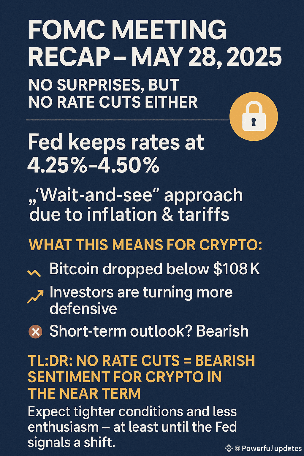 🧠 TL;DR: No rate cuts = bearish sentiment for crypto in the near term. Expect tighter conditions and less enthusiasm — at least until the Fed signals a shift.#BinanceHODLerSOPH #Bitcoin2025 #BinanceAlphaAlert #WriteToEarnWCT #TrumpTariffs $BTC
