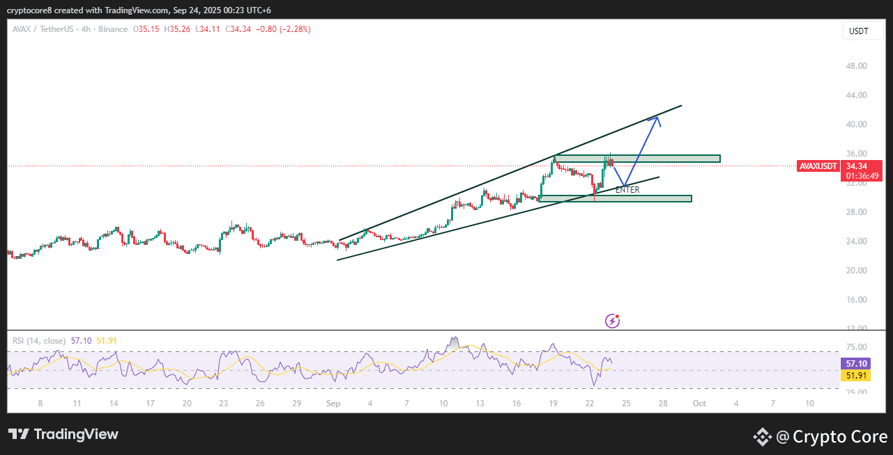 This chart shows AVAX moving inside an upward channel. Price is pulling back toward the support zone marked “ENTER.” From here, a rebound is expected, aiming for higher resistance levels near $40. RSI supports momentum, signalling a bullish trend.